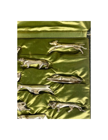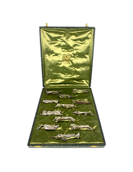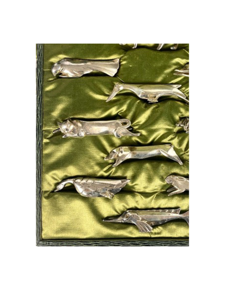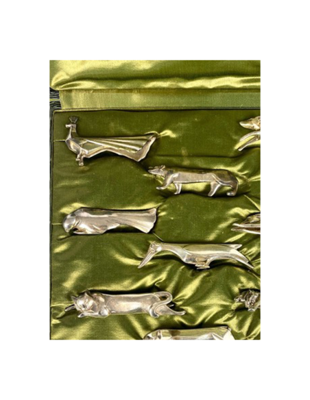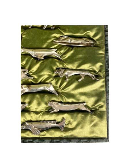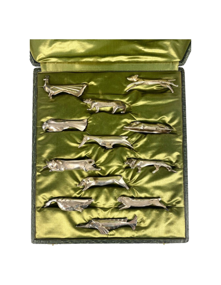 Twelve animal knife holders in silver metal Original box Circa 1940