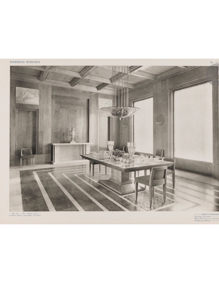 DUFRÊNE (Maurice). Furniture sets. Exposition internationale 1925. Paris: Charles Moreau, [1926]. -3 albums in-folio, 450x325: (4 ff.), 32 plates; (2 ff.), 32 plates; (2 ff.), 32 plates. In sheets, in blue cloth-backed cardboard folder, printed and laced. First edition of this complete series of three albums published by cabinetmaker, interior designer and decorator Maurice Dufrêne (1876-1955). They are devoted to the furniture ensembles presented at the 1925 Decorative Arts Exhibition. Each volume comprises a series of 32 photographic plates. A total of 110 interiors by leading Art-deco decorators and architects such as Lucie Renaudot, André Fréchet, Georges Bourgeois, Philippe Wolfers, Léon Jallot, René Crevel, Jacques-Émile Ruhlman, René Lalique, Majorelle, Louis Süe, André Mare, Paul Poiret and others are reproduced. The text pages are decorated with black-and-blue compositions by Maurice Dufrêne.
