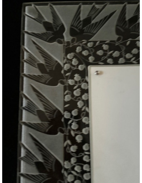 Lily of the valley and swallows" rectangular frame in moulded white glass with sandblasted engraved decoration. Signed "Lalique". Created around 1926. H: 39.5 cm W: 33 cm D: 18 cm