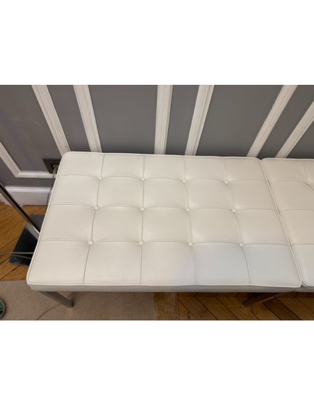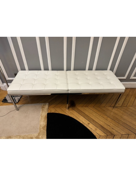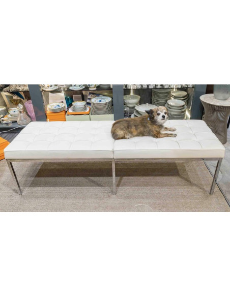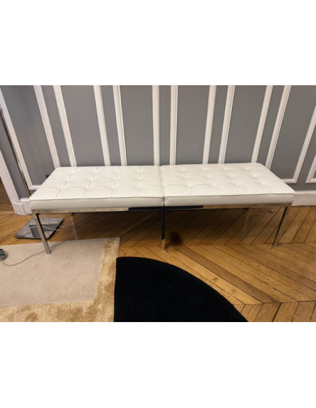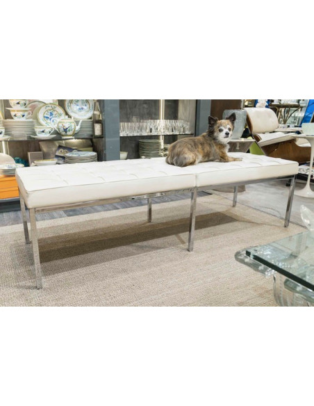 Florence Knoll is not only co-founder of Knoll International, but also a brilliant designer and pioneer in the production of modern furniture in the Bauhaus tradition. Her imaginative design had a lasting influence on the interior architecture of the time. The Florence Knoll bench rightly bears the name of its creator. The timeless seating furniture, which the designer conceived in 1954, impresses with the quality of its materials and its reduced-to-essentials design. The Florence Knoll bench has become a true classic and is offered by Knoll International in two sizes - as a two- and three-seater. This timeless piece of furniture is made from chrome-plated square tubular steel. Comfortable leather upholstery with piped seams and leather-covered buttons aesthetically completes the elegant bench. Florence Knoll's original bench can be identified by the embossed Knoll logo and the designer's signature on the bench frame.