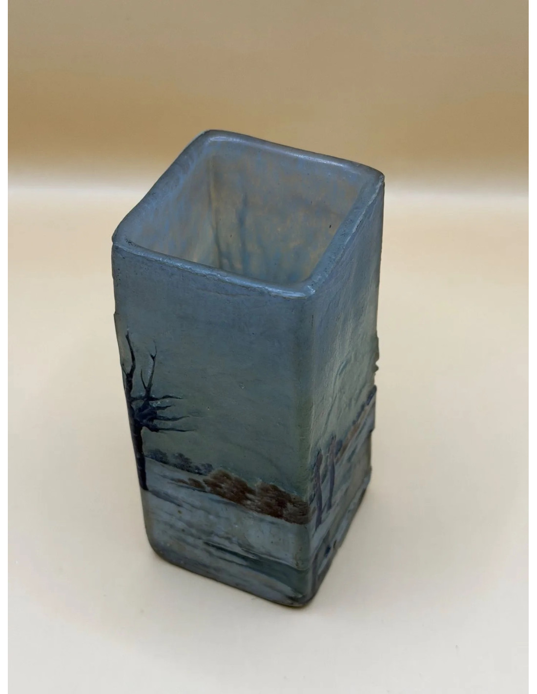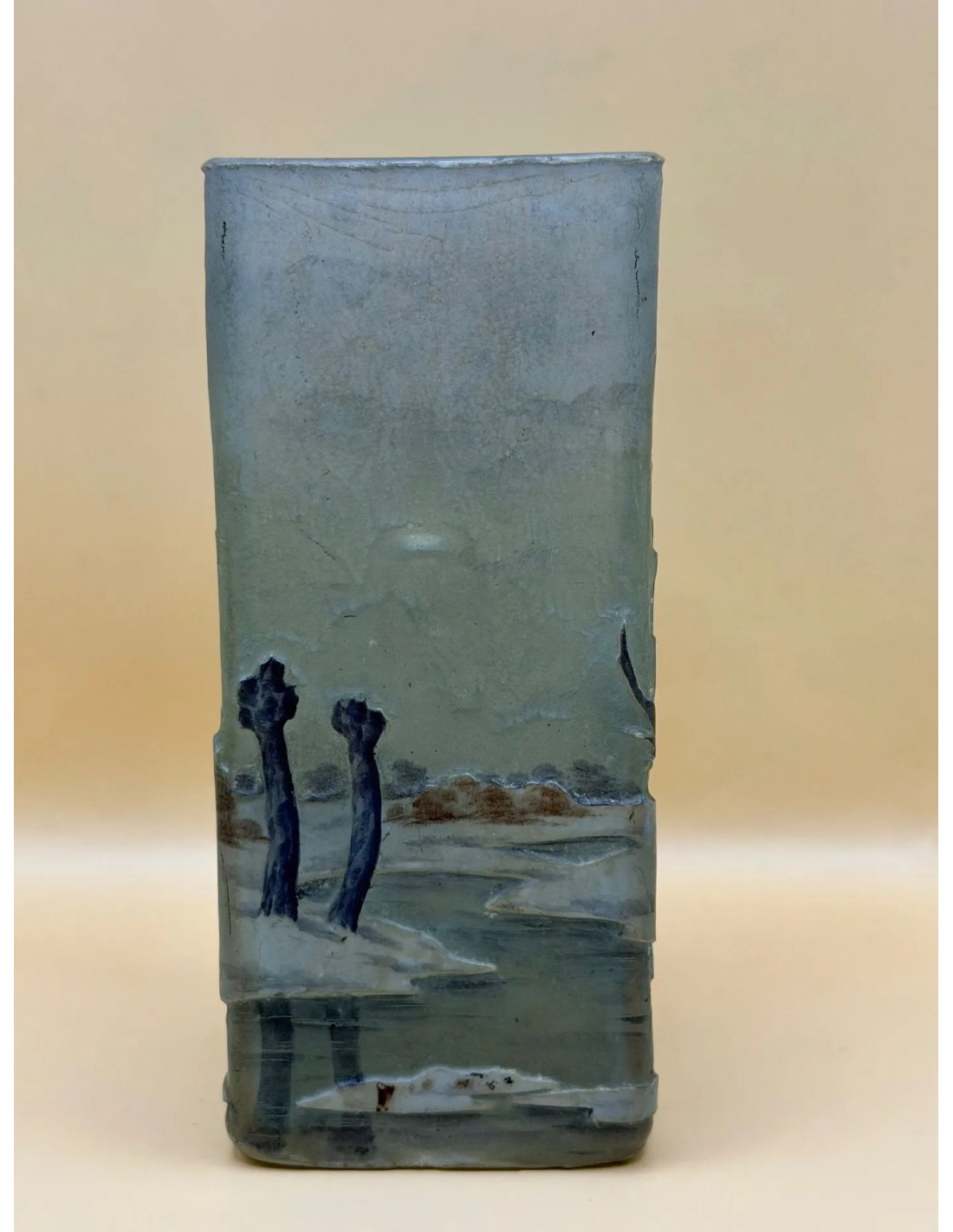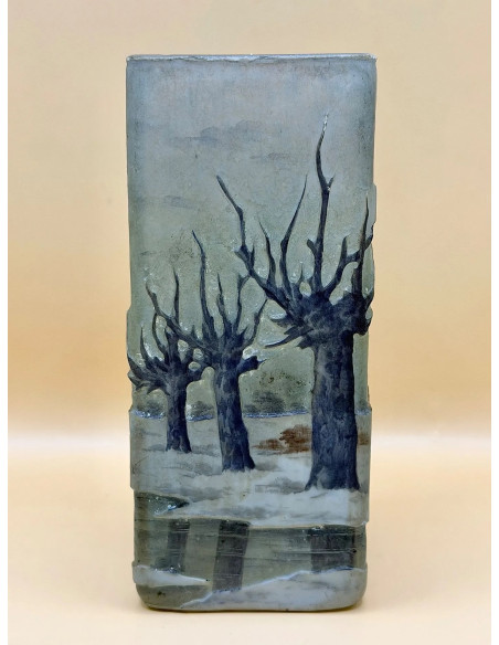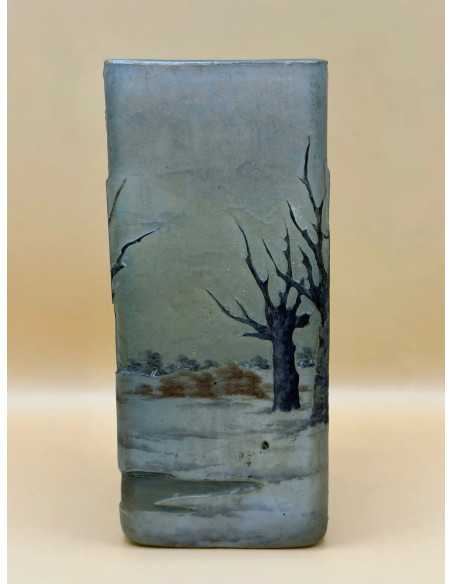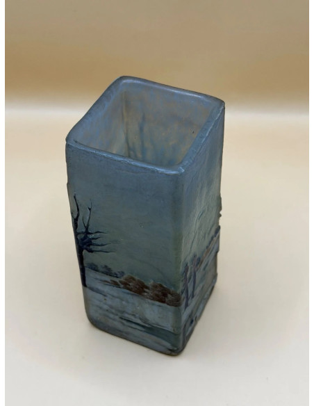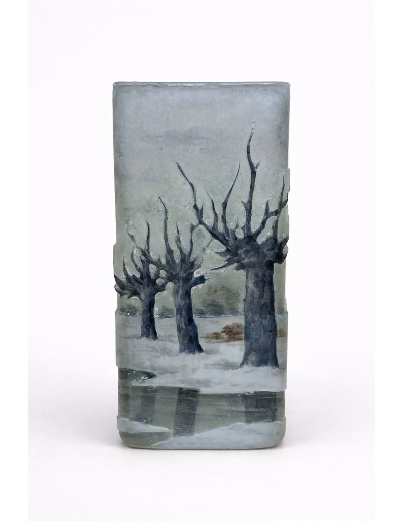 DAUM NANCY square-section vase in multi-layered glass , acid-etched and enamelled decoration depicting a winter lakeside landscape on a shaded grey background.