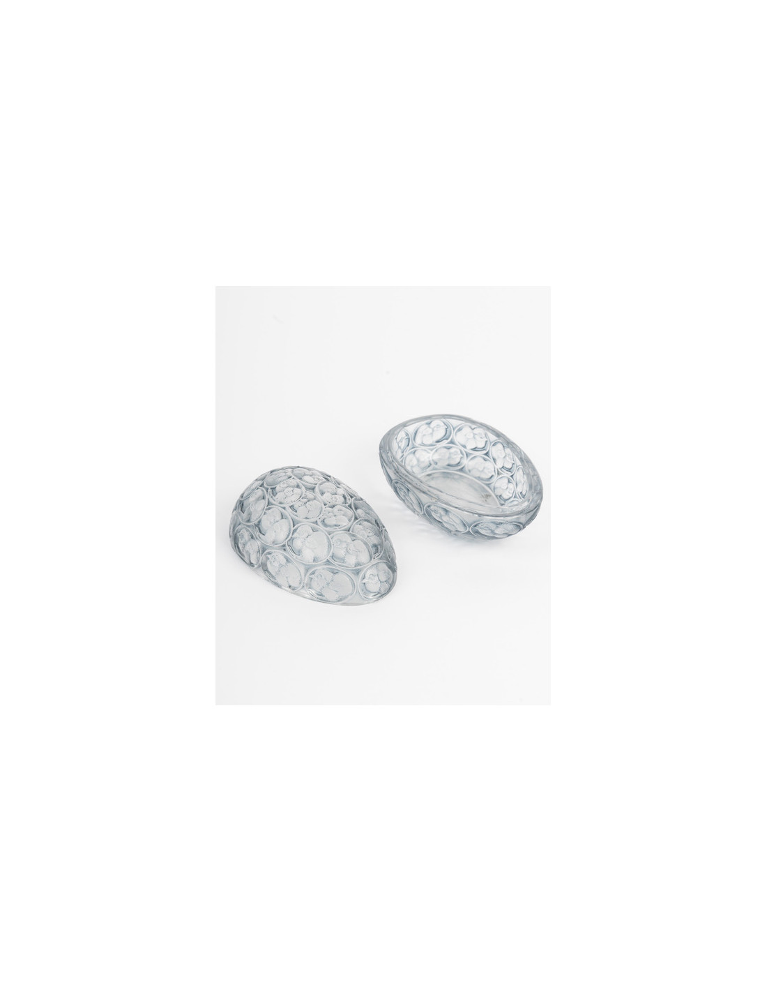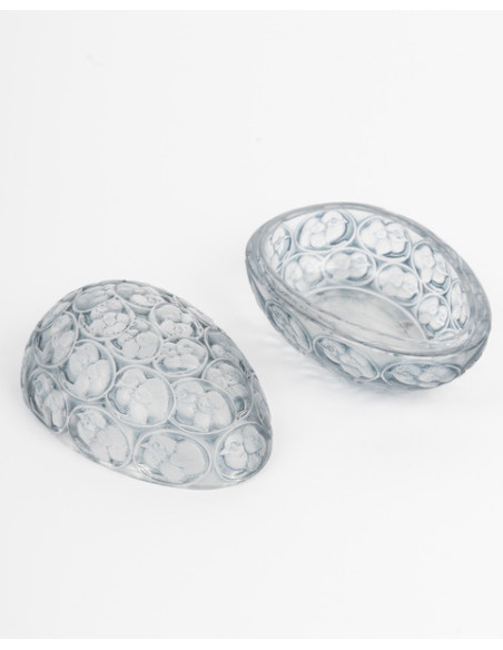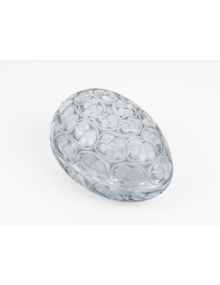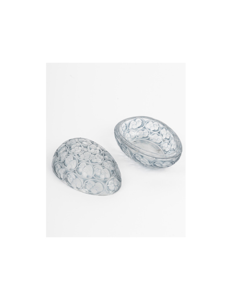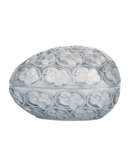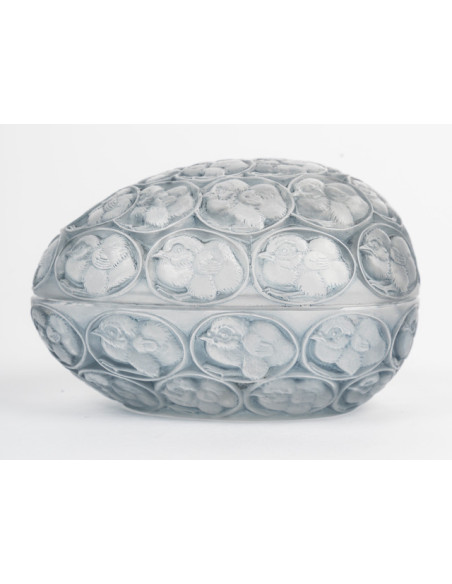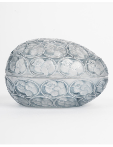 "Chicks" box in pressed molded white glass, enhanced with a gray-blue patina.