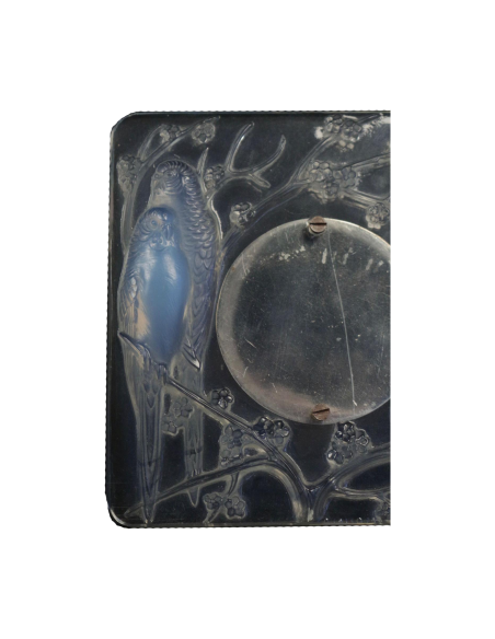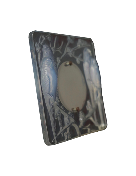 Opalescent pressed molded glass frame decorated with couples of parakeets in the branches