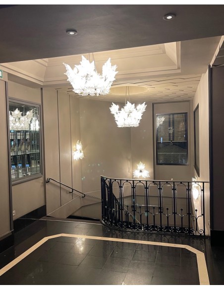 The two-row suspension is composed of platane leaves in pressed, satin-finish, matte and glossy molded crystal, mounted in metal.
