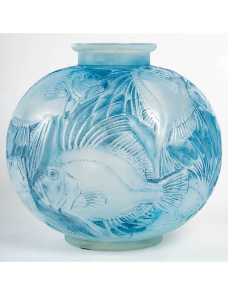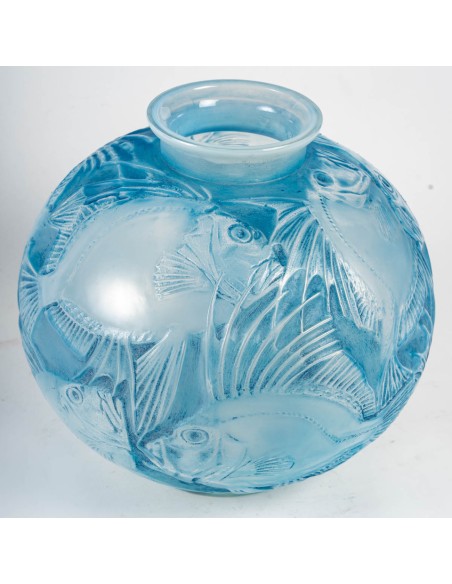 "Fish" vase in ovoid shape with flared neck in opalescent molded white blown glass and enhanced with a blue patina.