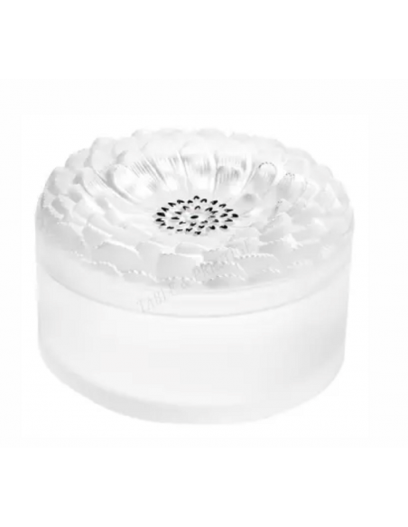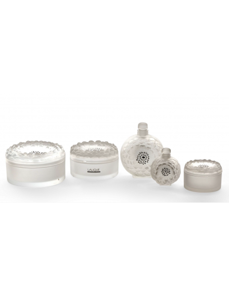 Lalique France Toilet set in pressed molded glass with floral decoration comprising three boxes and two bottles.