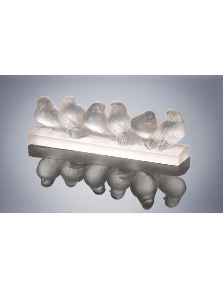 A 29.5 centimeter rectangular clear and frosted glass base supporting six bird figures incorporated into various