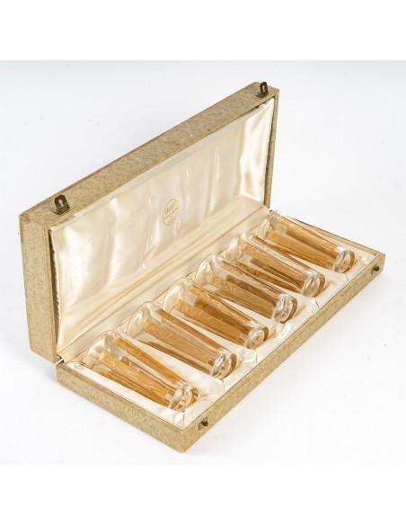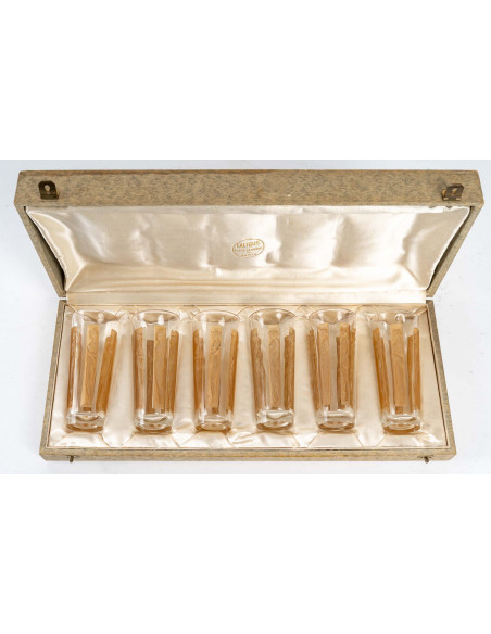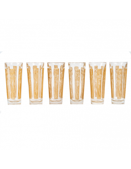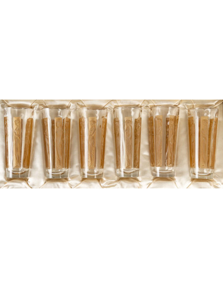 Set of 6 goblets with title motifs in vertical reserves. Pressed-molded glass proofs (ref. Marcilhac 3400), enhanced with an original sienna patina.