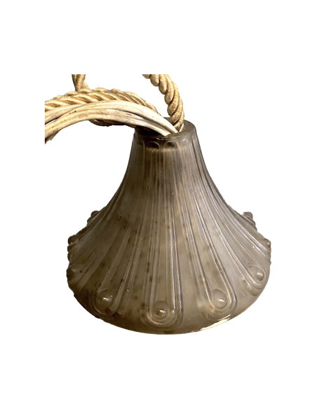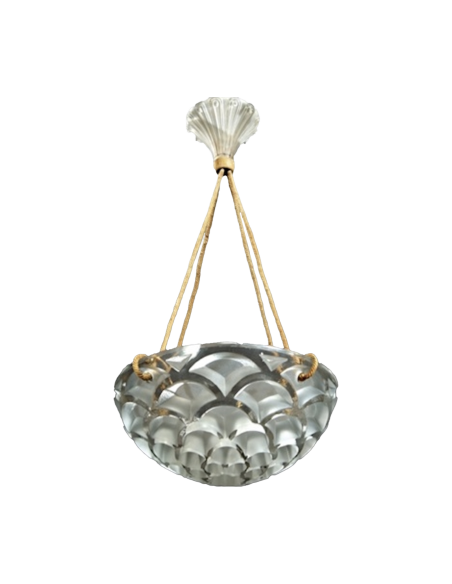Suspension model "Rinceaux" presenting a basin in satin-pressed moulded white glass, held by a system of cords and surmounted by a ram cover.