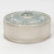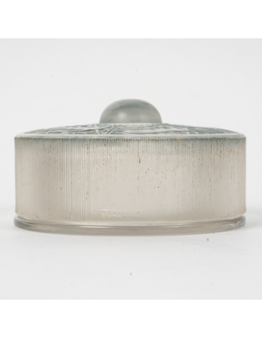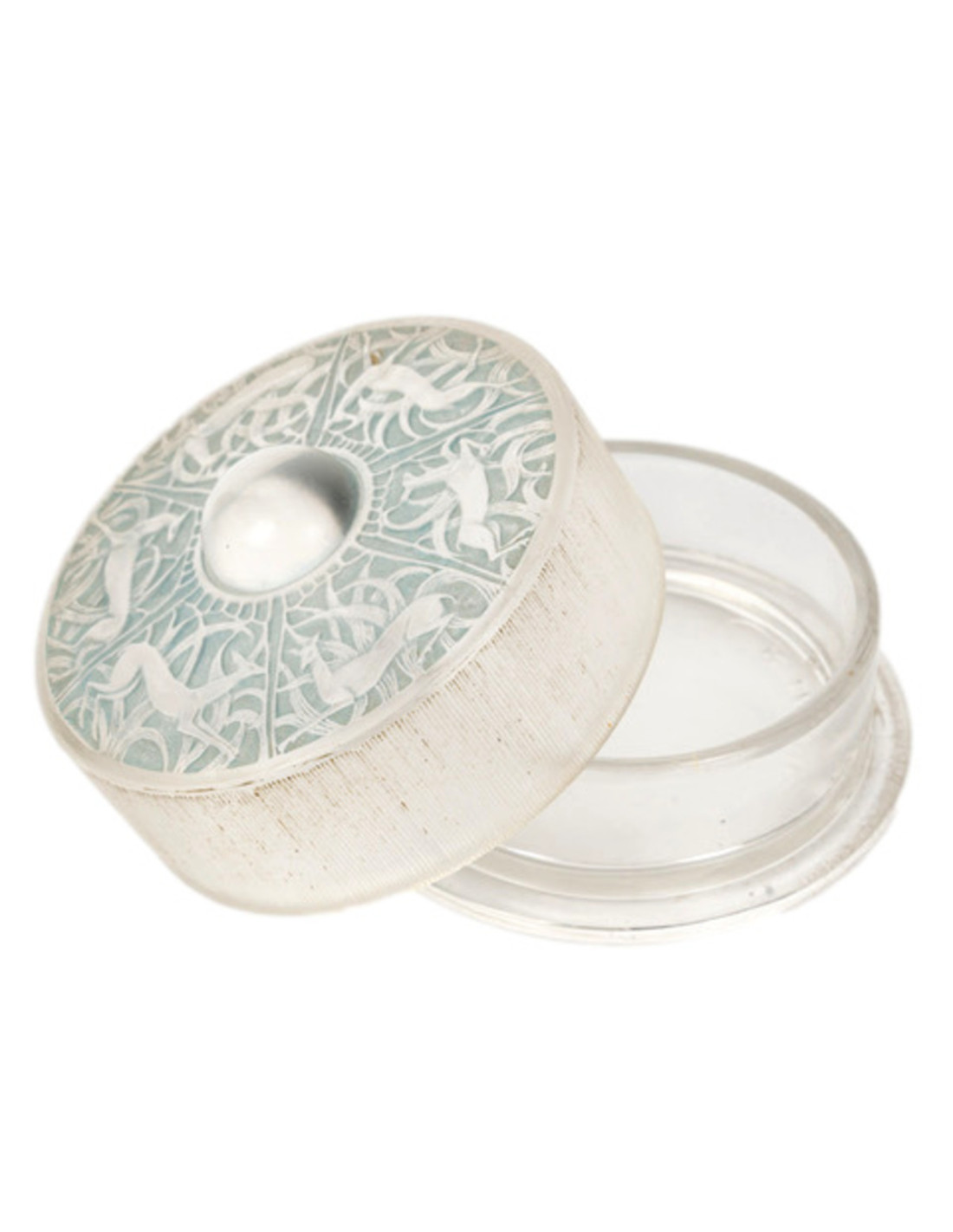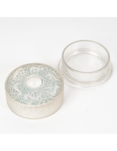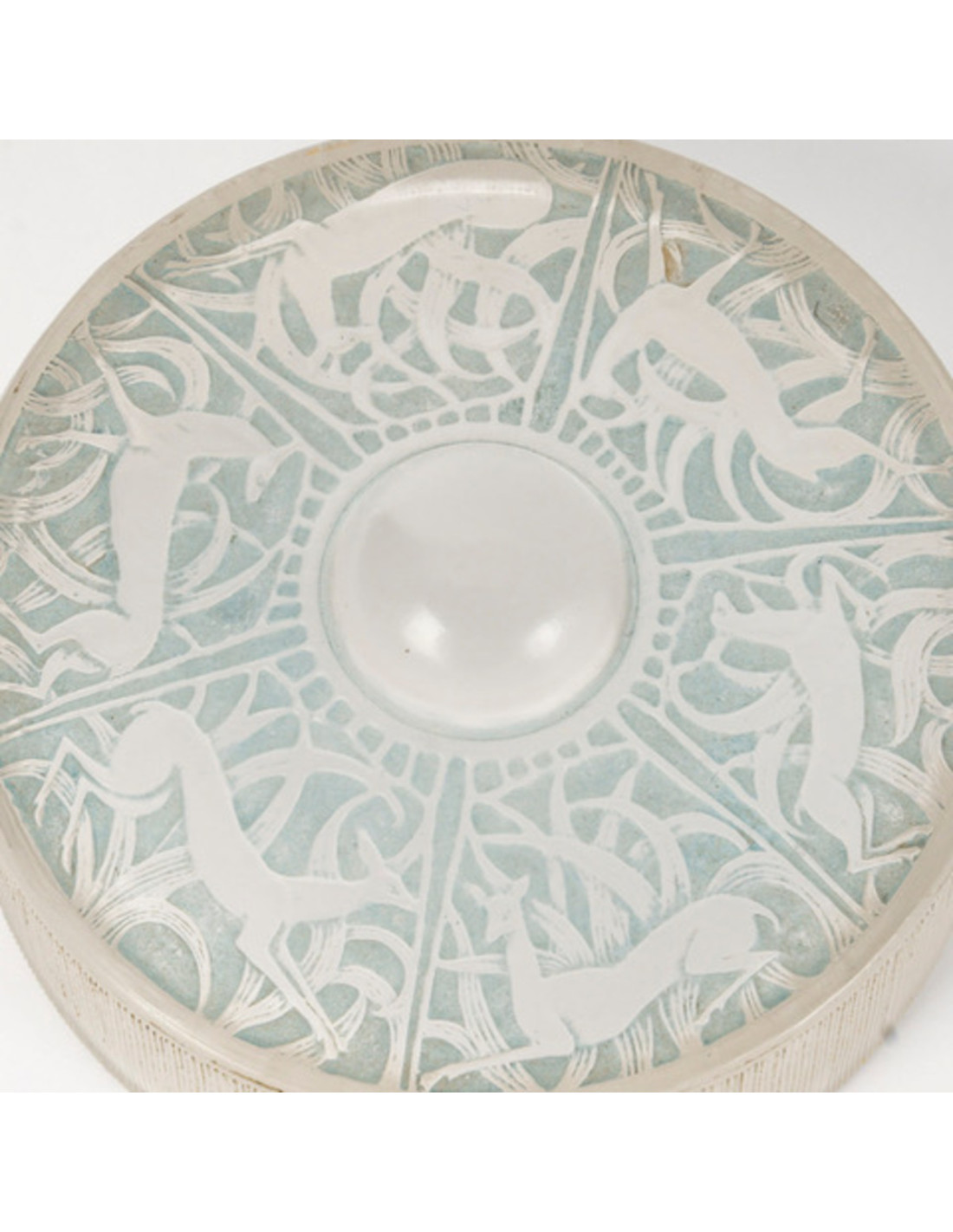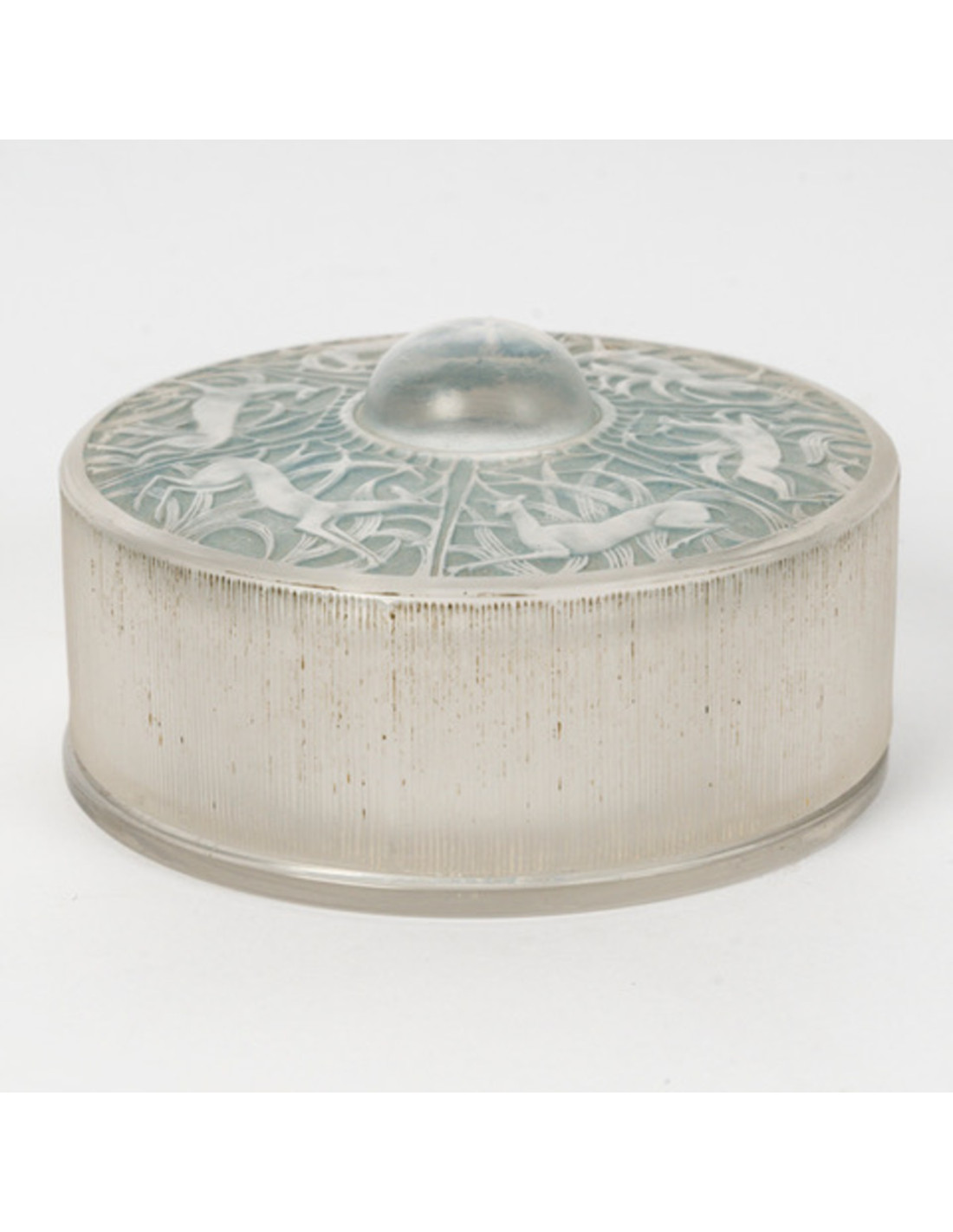Molded pressed white glass box with a polished glass base and satin glass lid decorated with deer, enhanced with a light blue patina.