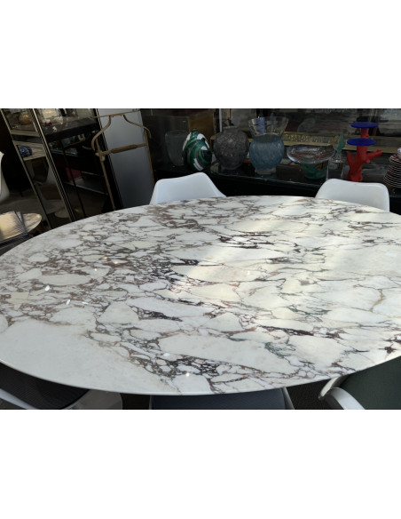 Cette table, conçue par Eero Saarinen en 1957, est un exemple parfait du mariage entre fonctionnalité et design élégant. Le plateau de 2 cm d’épaisseur en marbre Calacatta oro verde, avec un vernis polyester brillant et un chant biseauté, apporte une touche luxueuse. Le piètement en fonte d'aluminium, avec finition Rislan blanc, assure stabilité et modernité. Idéale pour accueillir environ 8 personnes, cette table est une pièce maîtresse pour toute salle à manger.