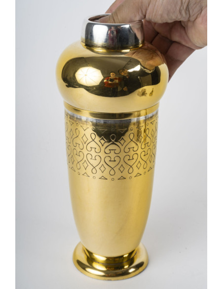 SHAKER en vermeil reposant sur un piédouche rond le corps de forme ovoïde est gravé à mi-corps d’un décor géométrique sur deux frises, renflé au niveau de la grille intérieur et recouvert d’un chapeau surmonté d’une sphère.
