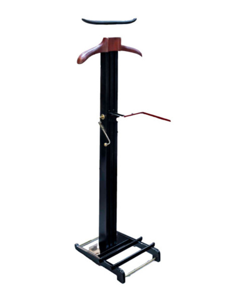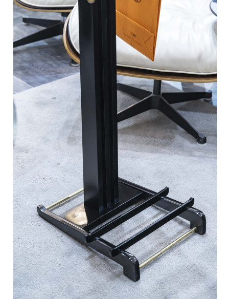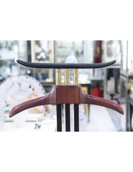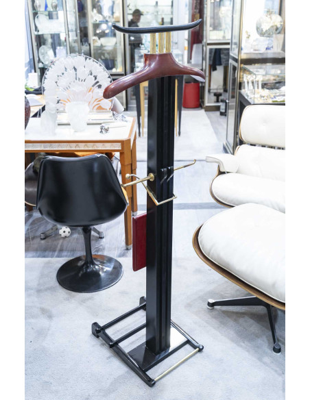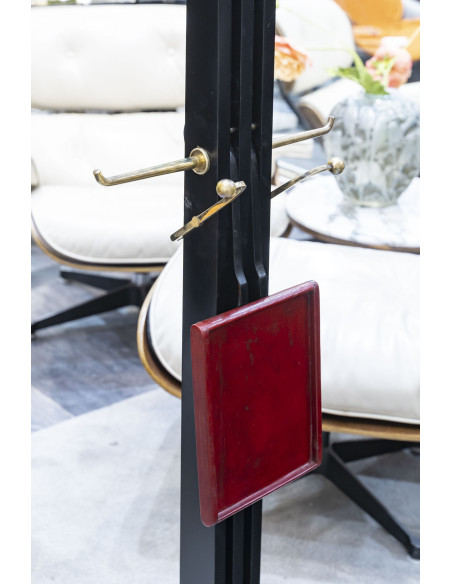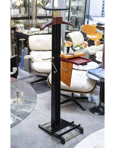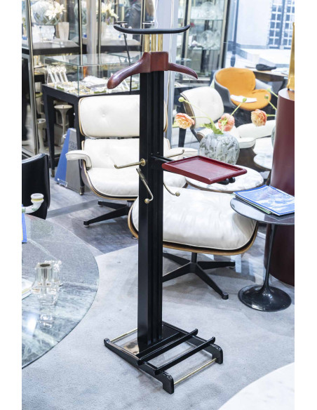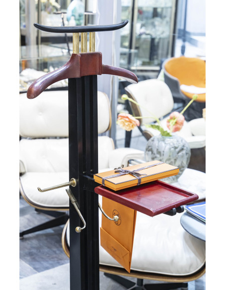 Valet de nuit en poirier noirci, la monture en laiton doré . Le cintre et la tablette escamotable sont gainés d’un cuir rouge de la maison Hermès.