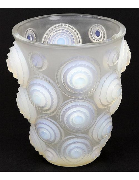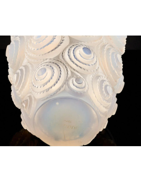 Vase en verre moulé pressé opalescent créé par René Lalique en 1930.