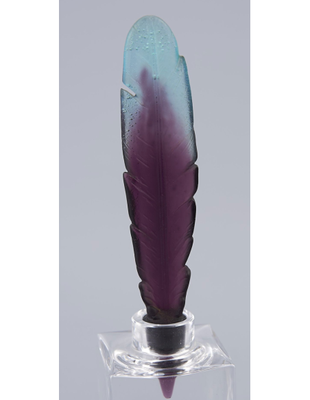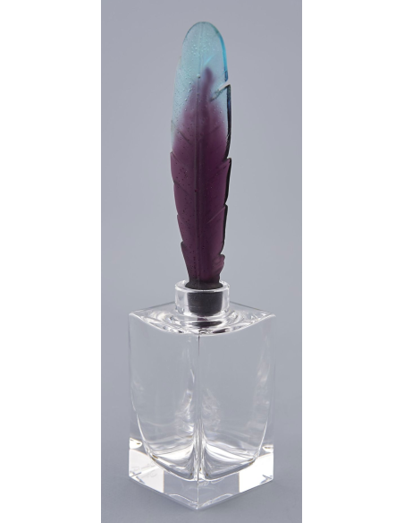 Flacon encrier en cristal et plume en pâte de verre polychrome bleu et violine. H. : 22,5 cm