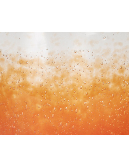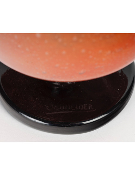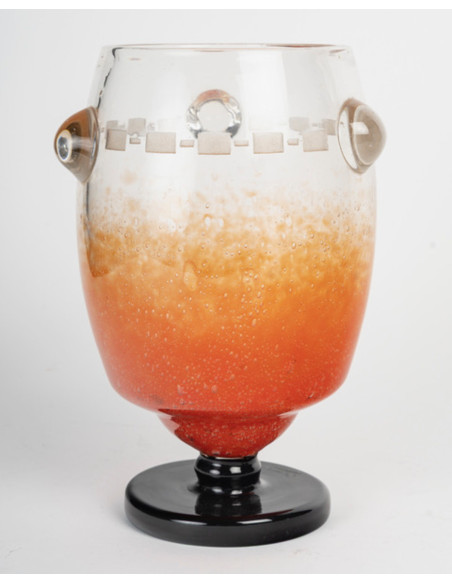 Vase sur pied douche en verre incolore et a fortes bulles ,coloration intercalaire avec fusion de poudres orangées .