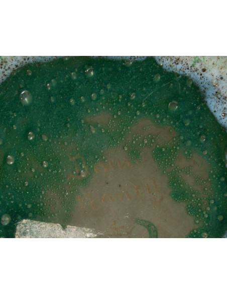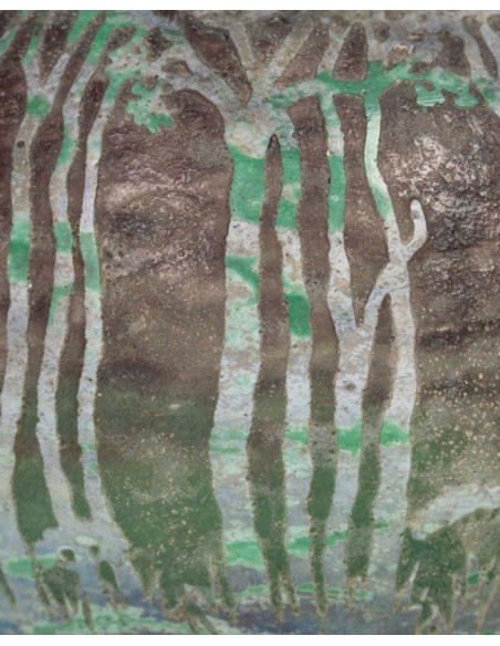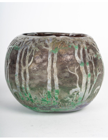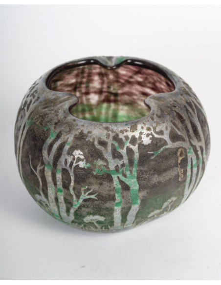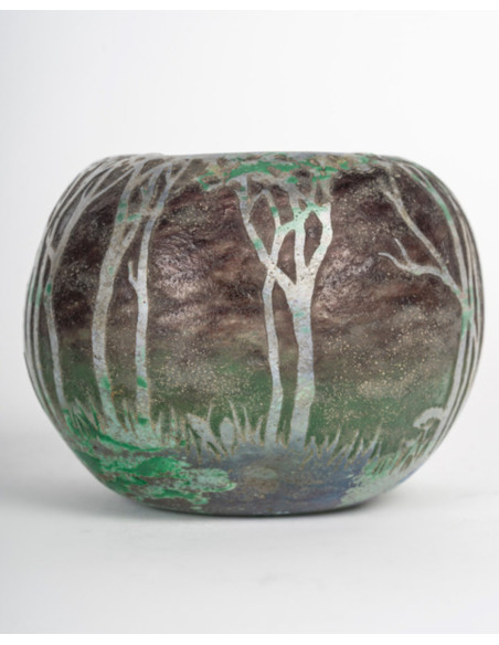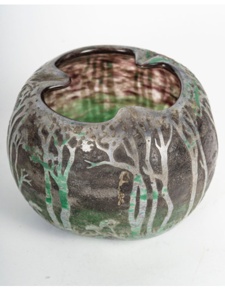 verre mélangé violet et vert. Décor d'un sous-bois gravé en réserve à l'acide et légèrement