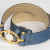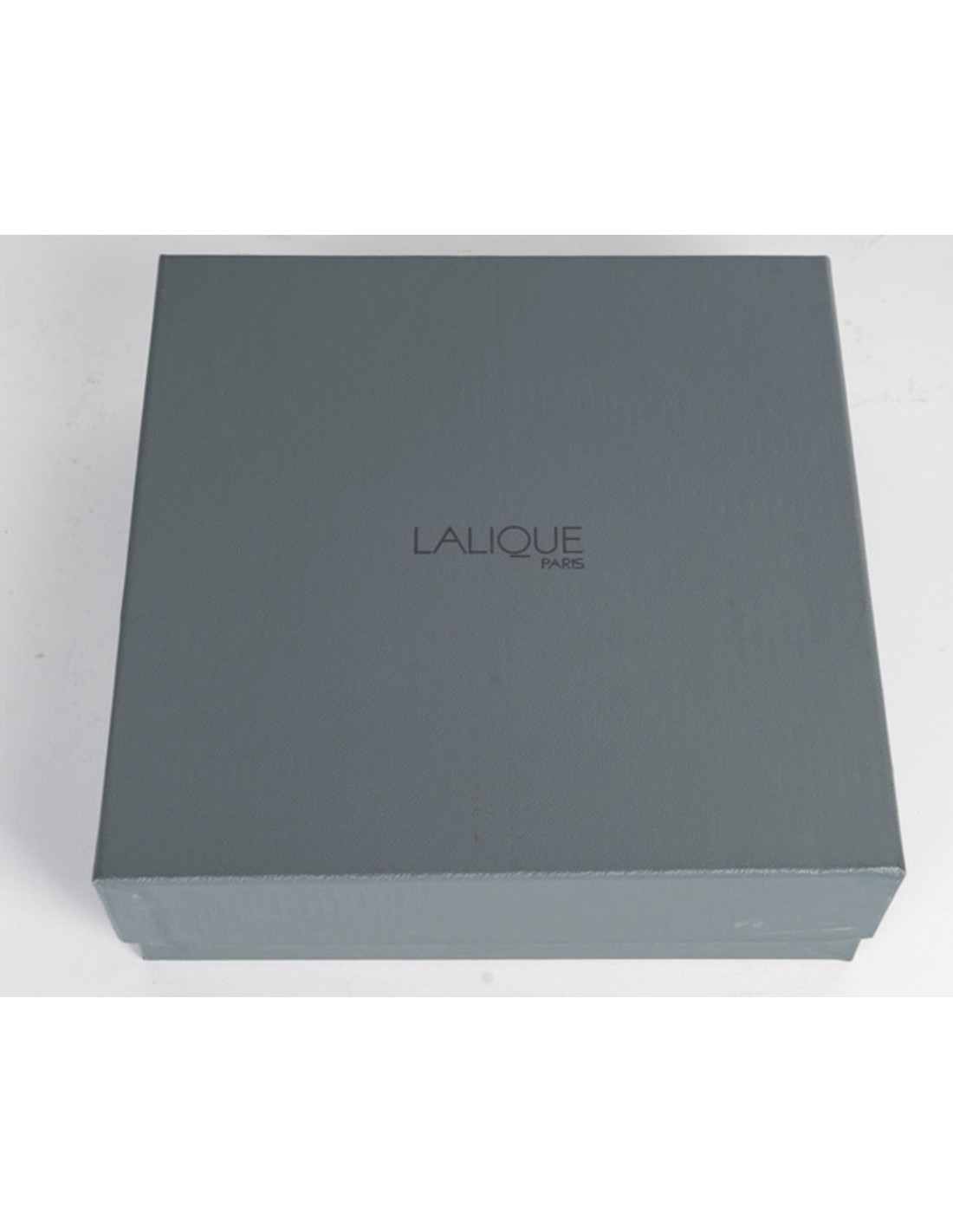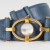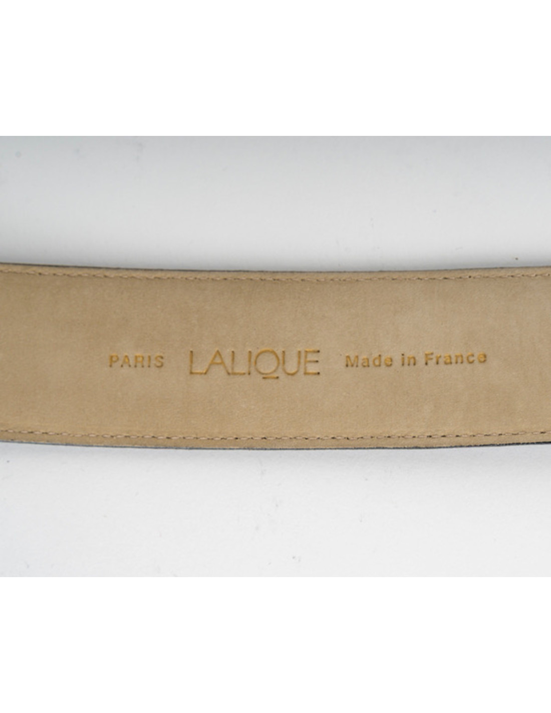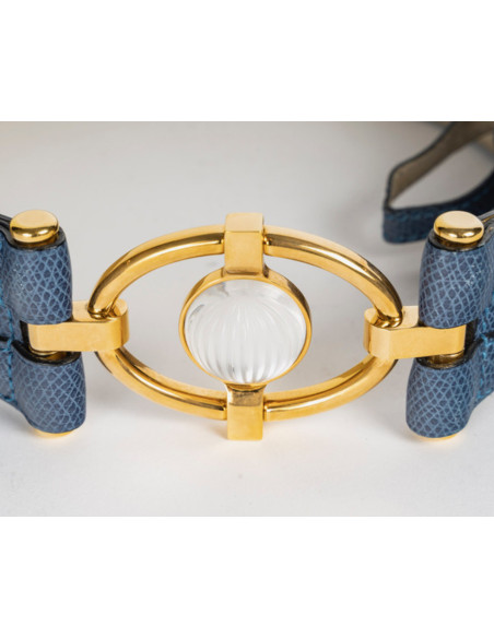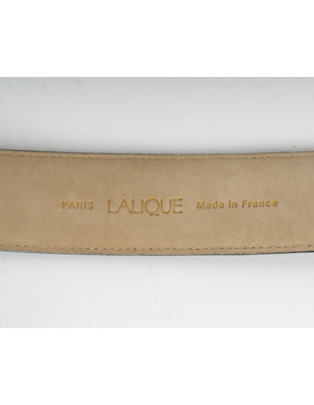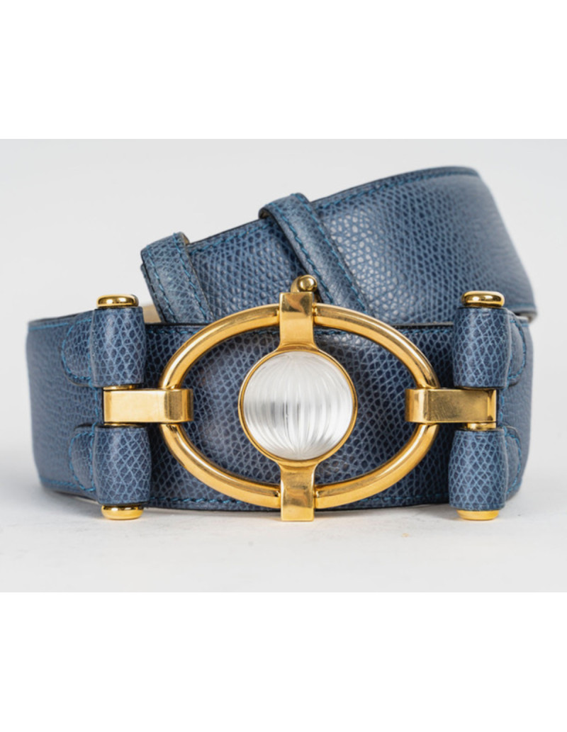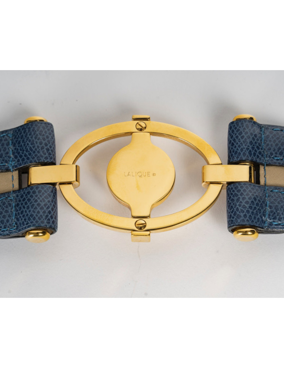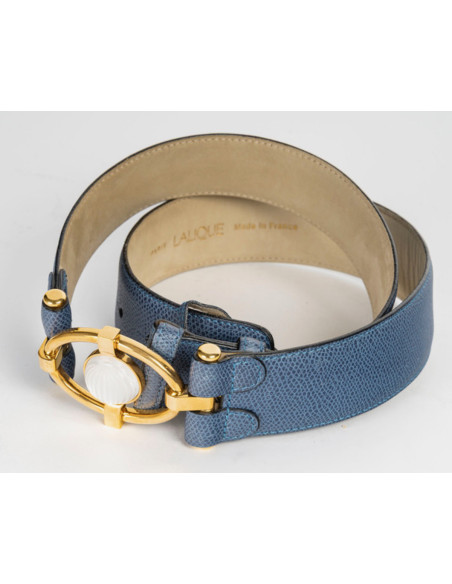 LALIQUE : ceinture en cuir de veau doublée vachette de teinte bleue, ornée d'un cabochon central godronné en cristal, garniture en métal doré, système d'attache perforé. Signature gravée Dans sa boite d'origine avec documentation