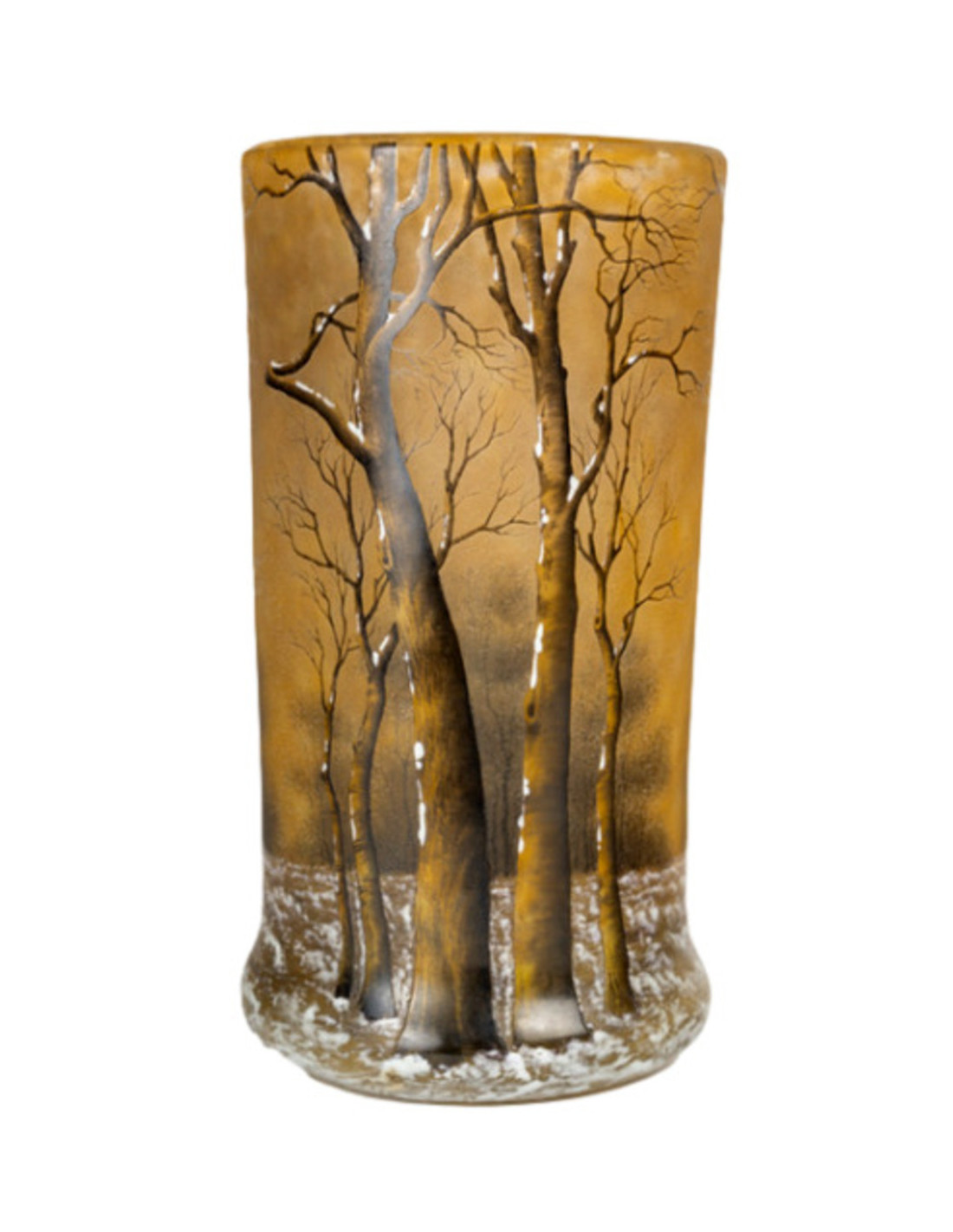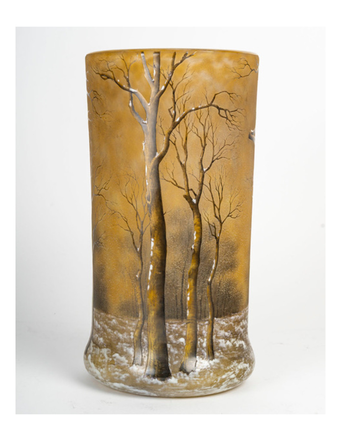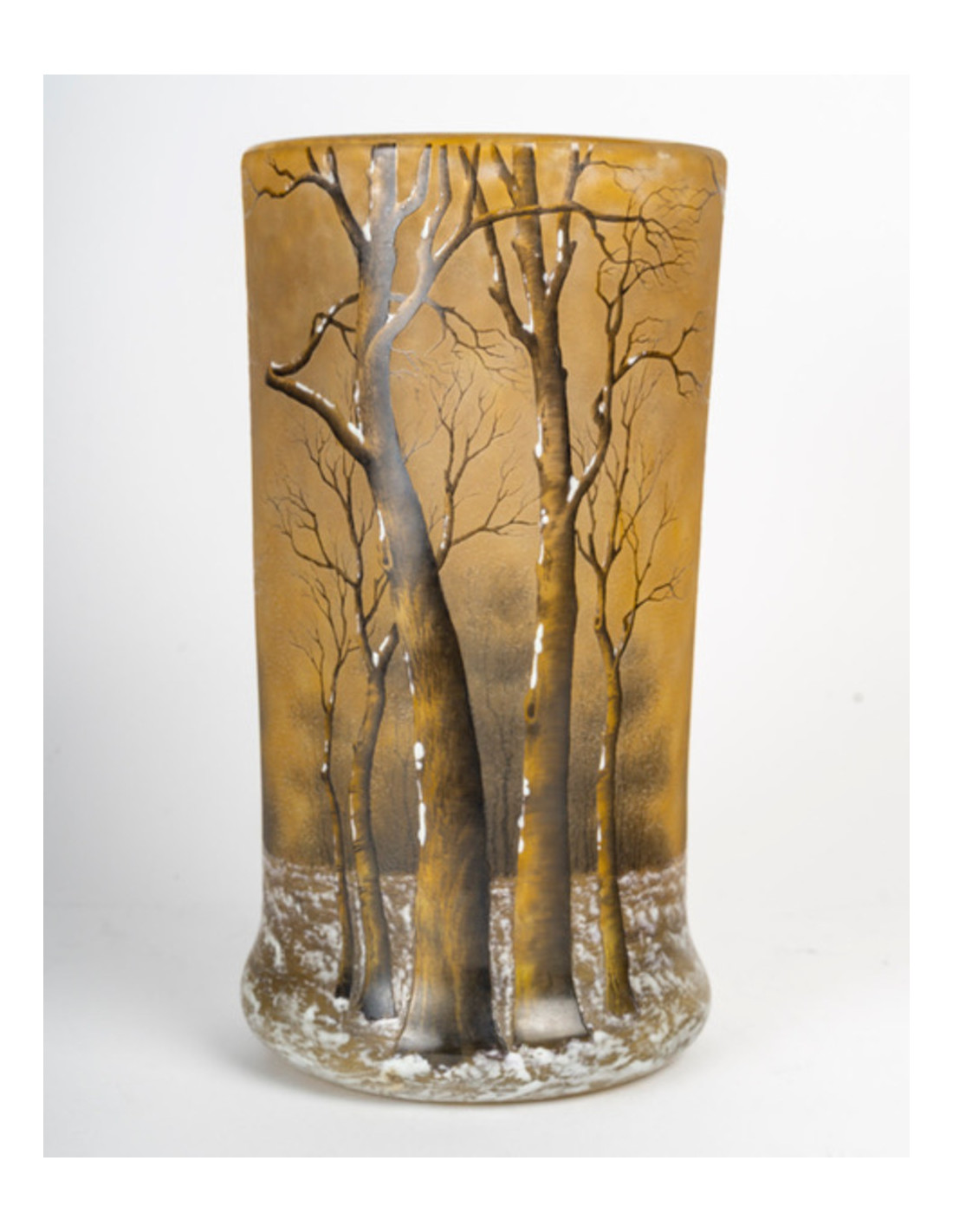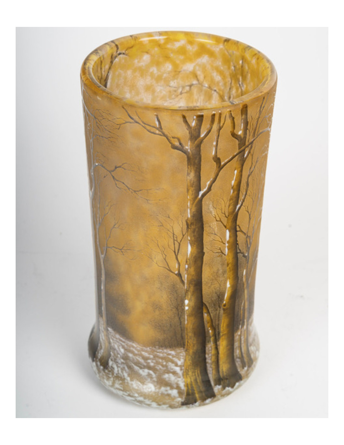 DAUM Nancy : Arbres sous la neige Vase en verre double couche de forme tubulaire à base débordante. Décor tournant gravé à l acide , émaillé a chaud d'arbres bruns dénudés, de sol enneigé et d'arbres peints en grisaille sur un fond moucheté de poudres jaunes et orangé.
