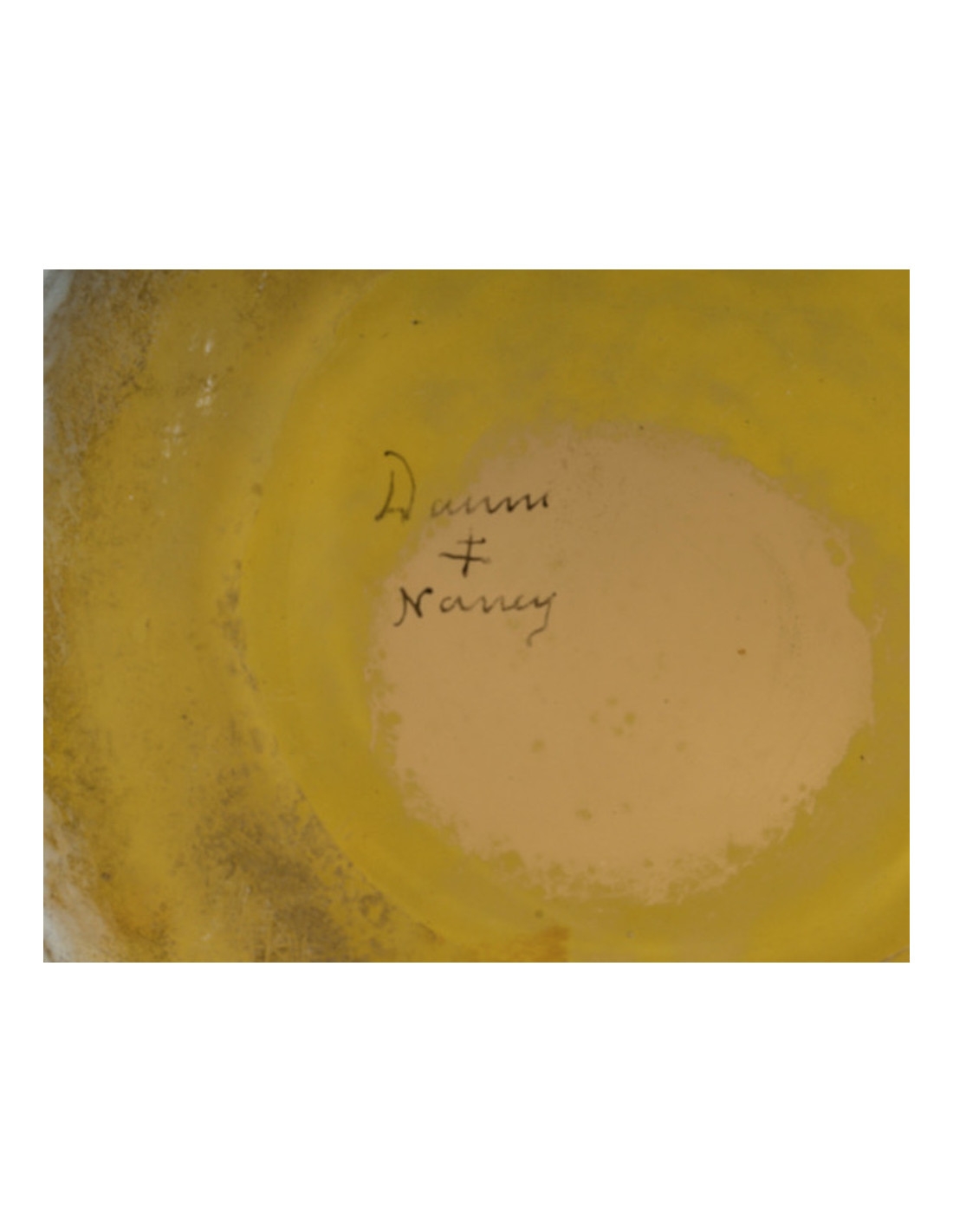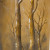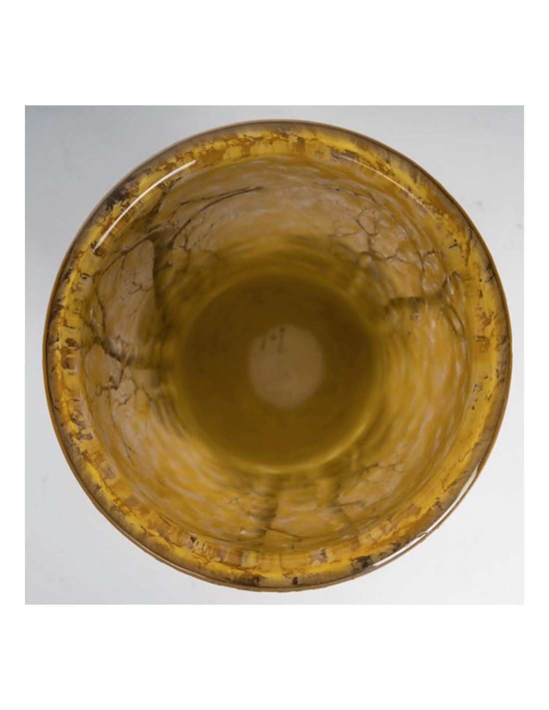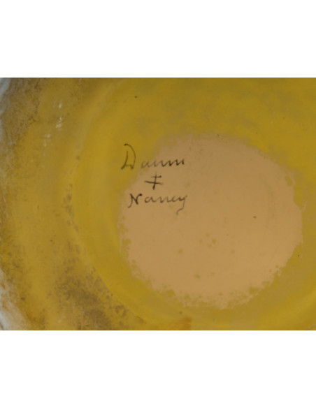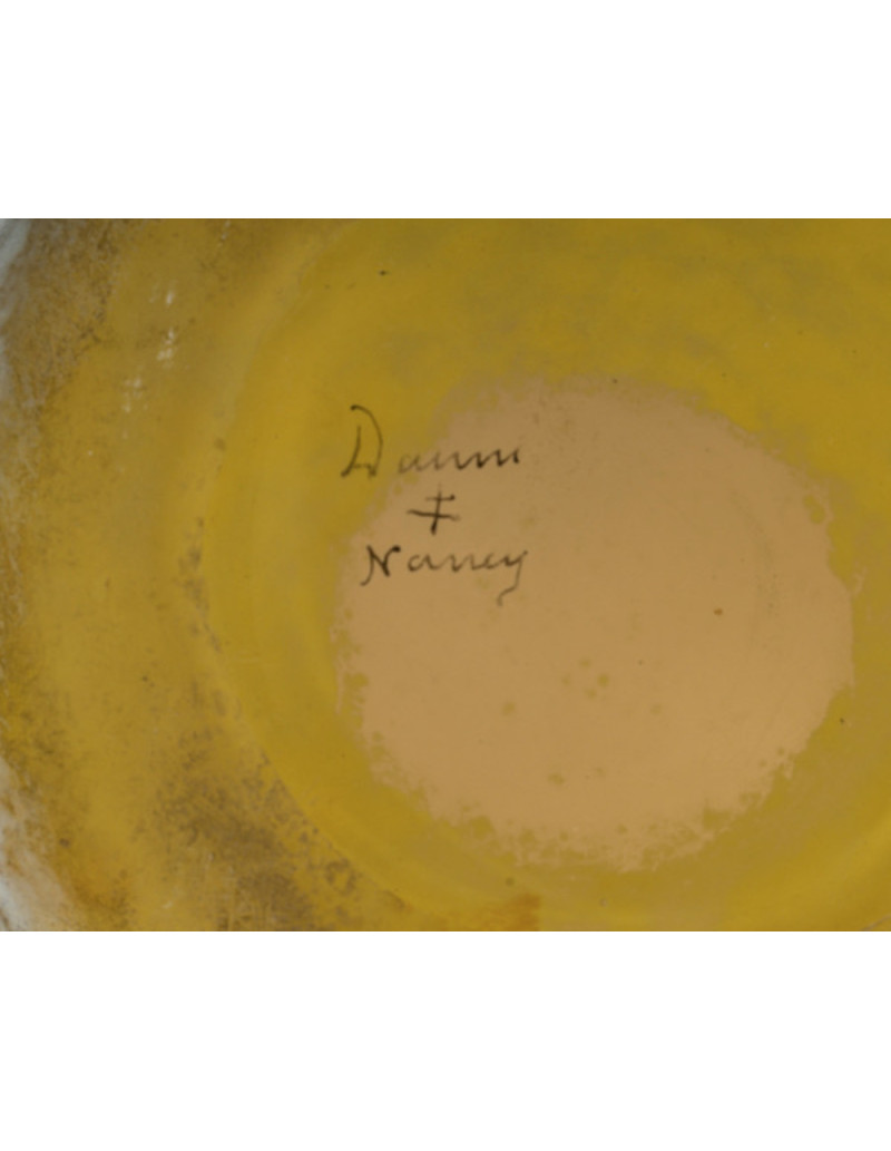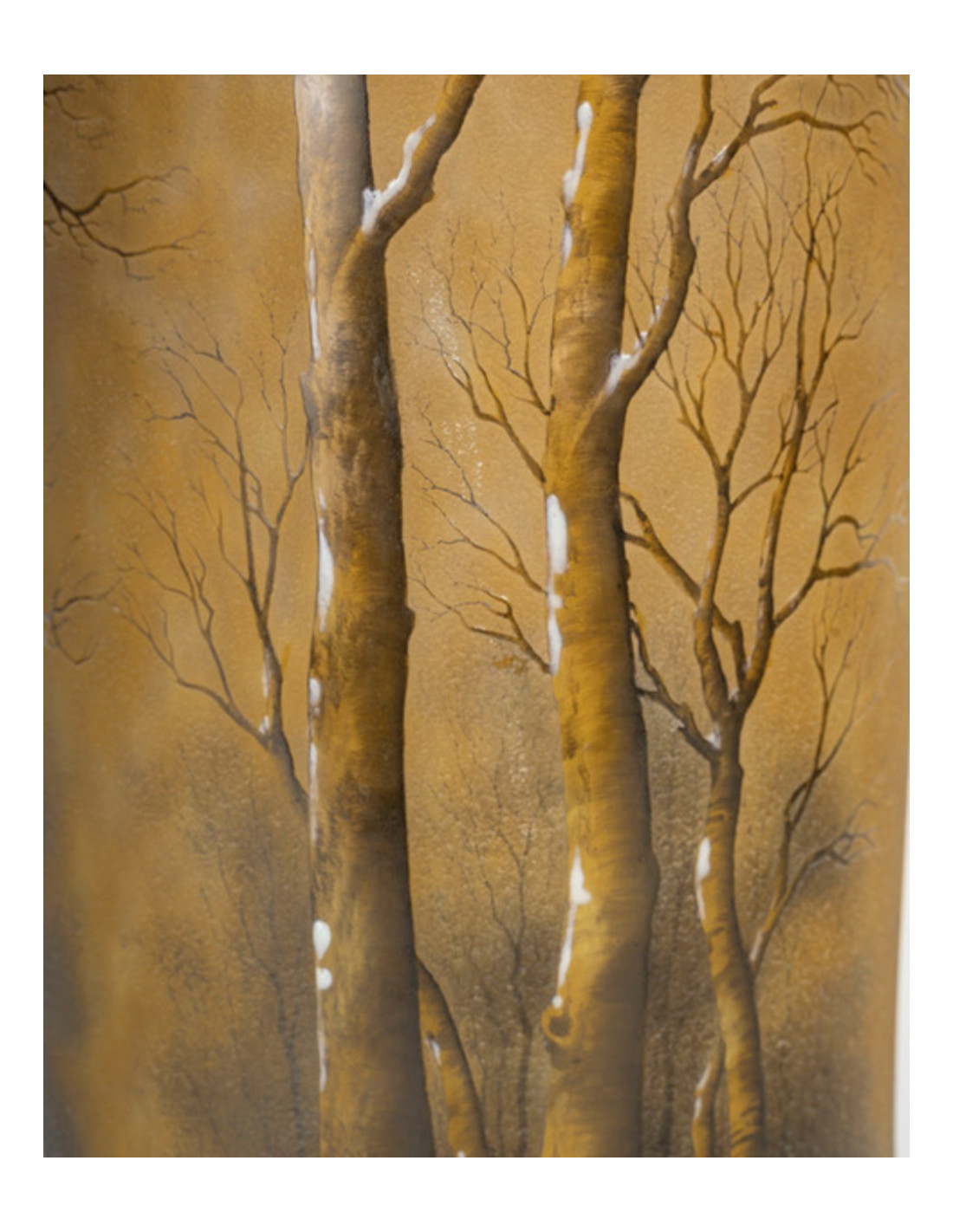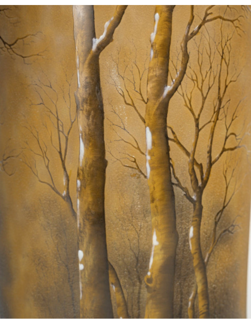 DAUM Nancy : Arbres sous la neige Vase en verre double couche de forme tubulaire à base débordante. Décor tournant gravé à l acide , émaillé a chaud d'arbres bruns dénudés, de sol enneigé et d'arbres peints en grisaille sur un fond moucheté de poudres jaunes et orangé.