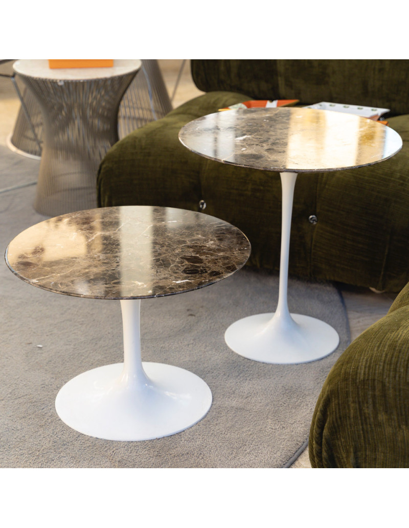 Guéridon à plateau rond en marbre emperador sur un pied tulipe.