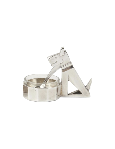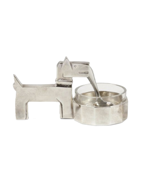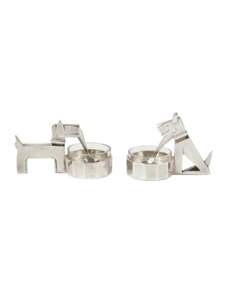 Paire de salerons en métal argenté en forme de chien devant leur gamelle avec deux pelles à sel.