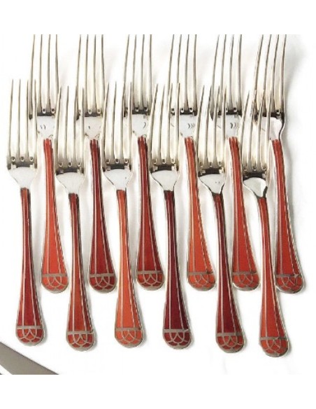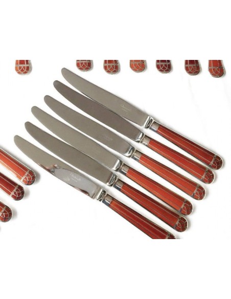 -Ménagère modèle TALISMAN en métal argenté et laque de Chine écaille siena composée de :