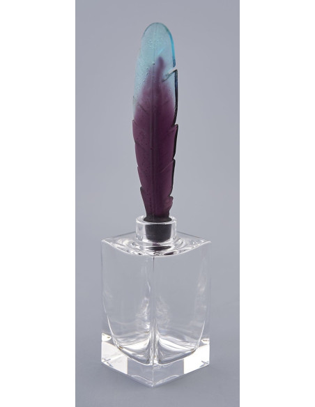 DAUM - encrier en cristal et plume en pâte de verre polychrome bleu et violine.