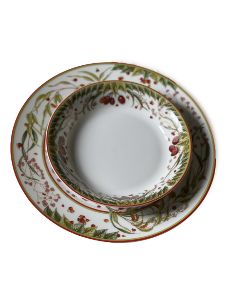 Le Jardin de Pythagore" d'Hermès en porcelaine blanche et multicolore, à motifs de fruits et végétaux, bordures rouges.