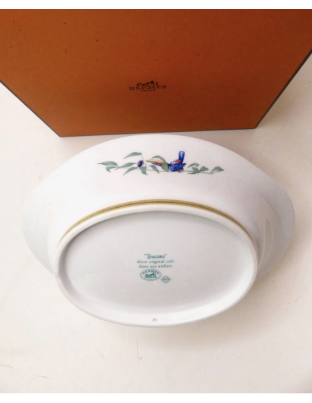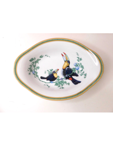 2 corbeilles ou plat creux de forme oblongue en porcelaine blanche de Limoges à décor polychrome de toucans.