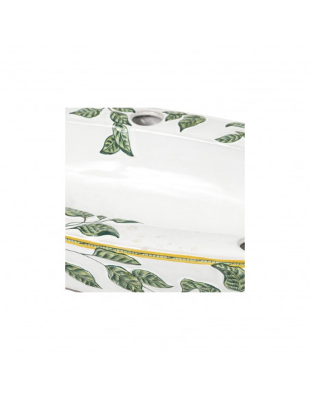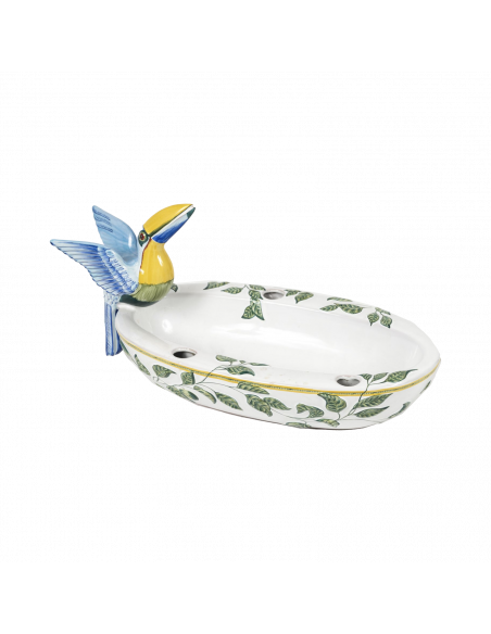 Grande coupe creuse ovale en faïence émaillée polychrome à décor d'un toucan posé sur le bord,