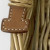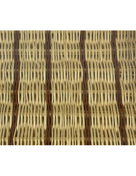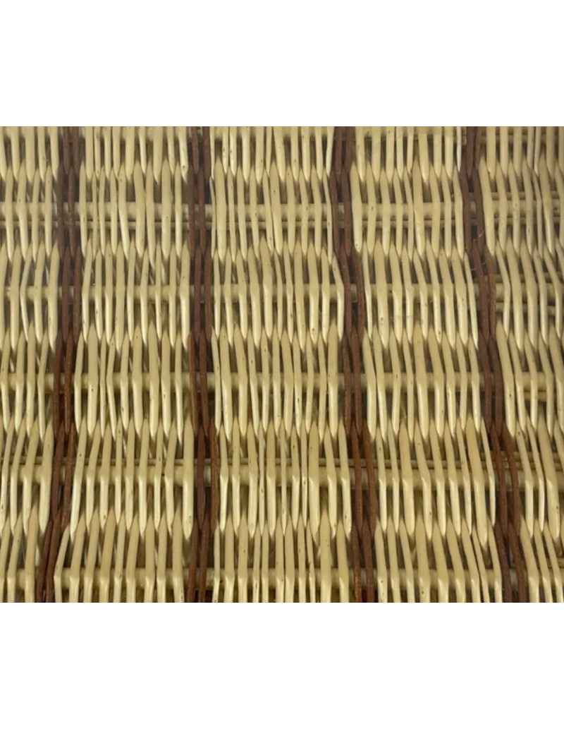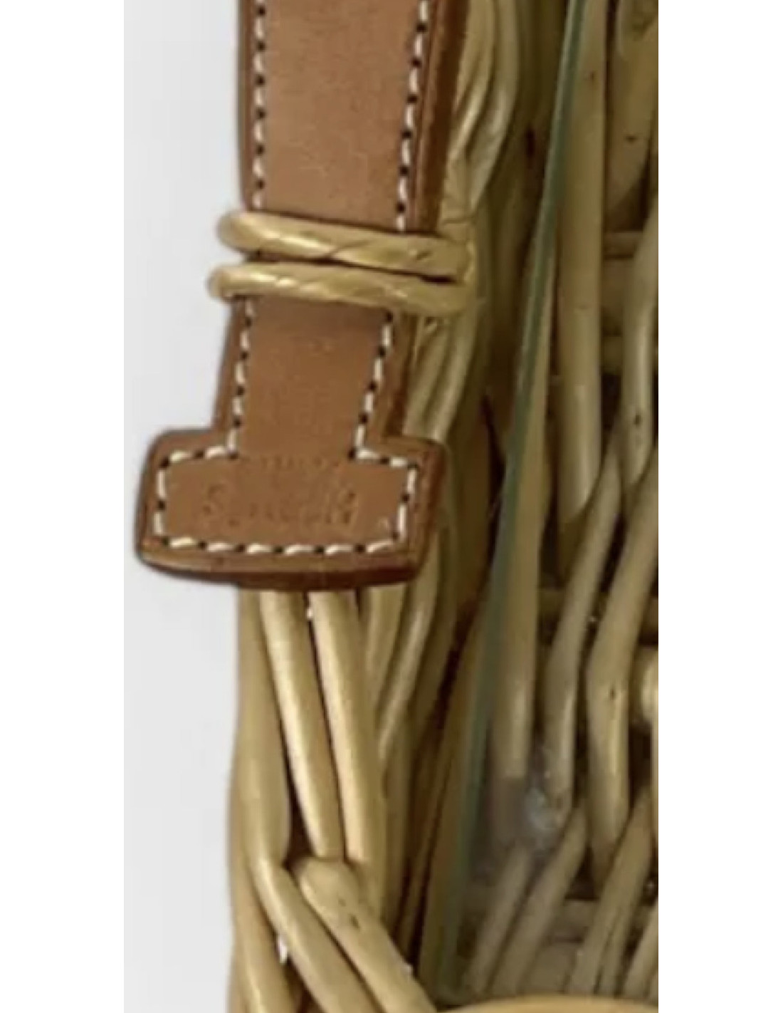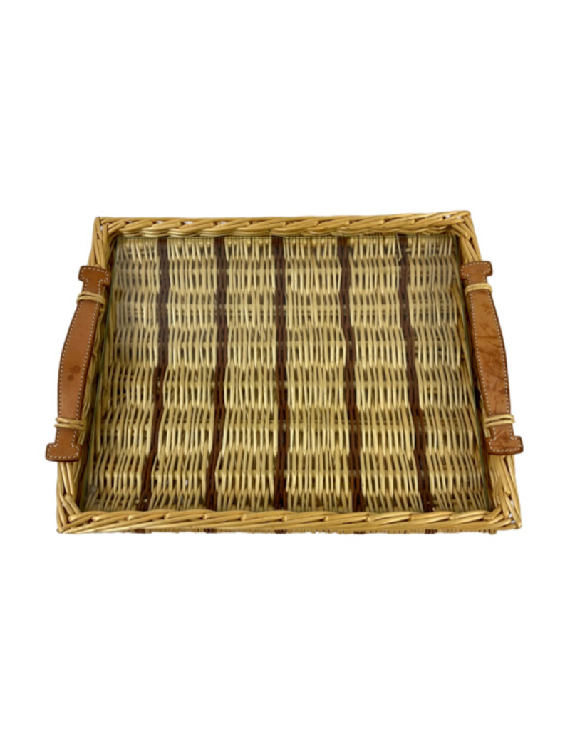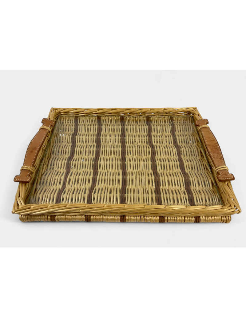 « Oseraie » Petit plateau rectangulaire en osier naturel, les prises en cuir surpiqué, gold et patiné brun