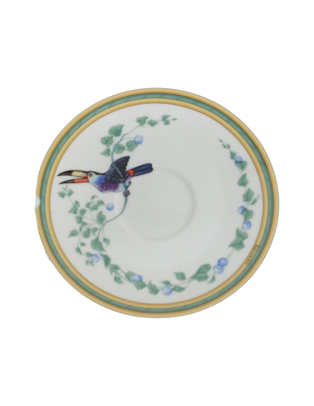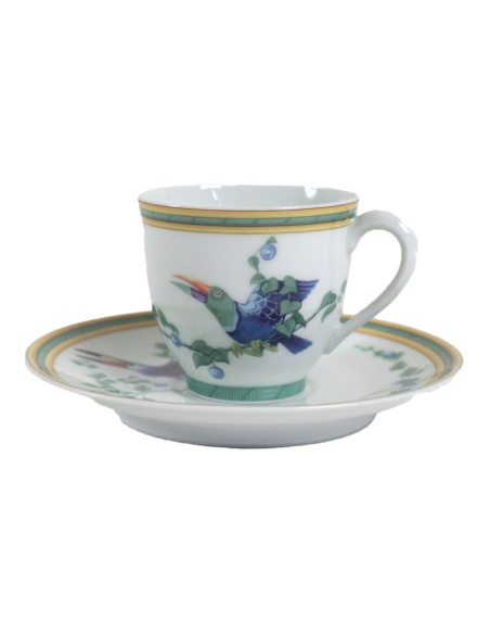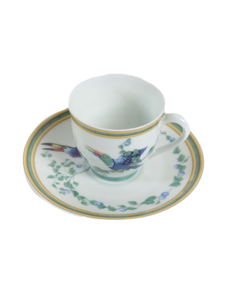 Tasse en porcelaine blanche de Limoges à décor polychrome et sa sous tasse.