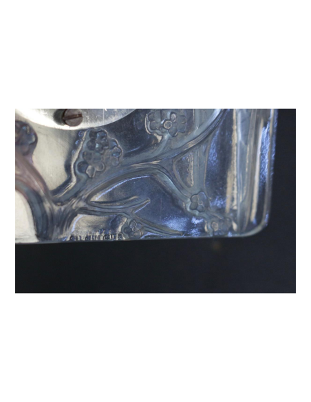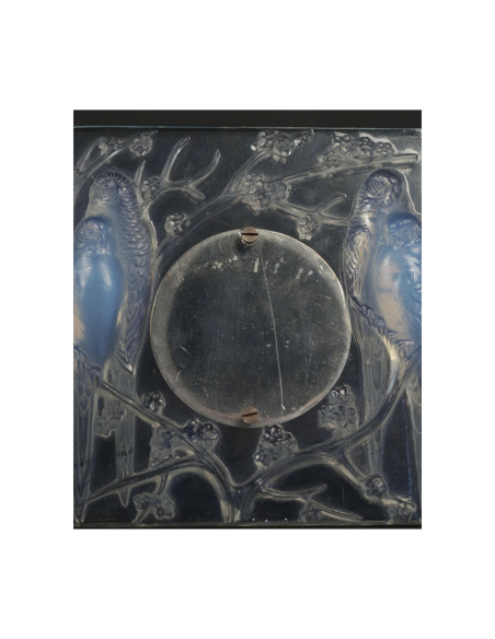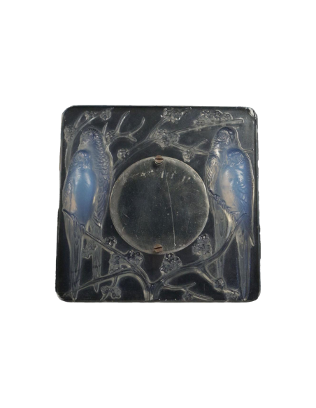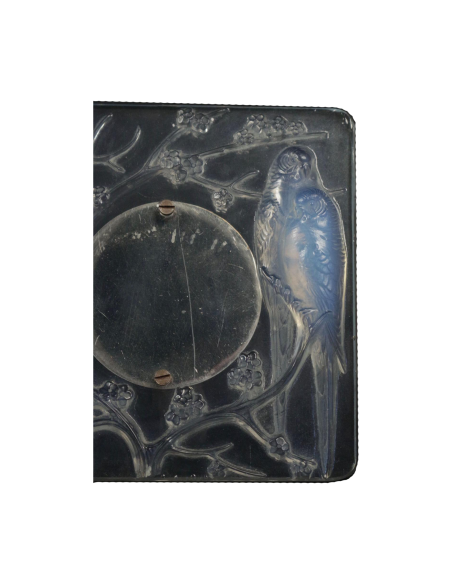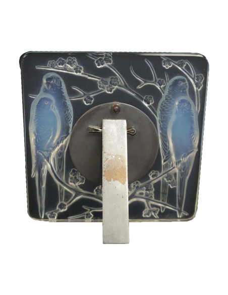 Cadre en verre moulé pressé opalescent à décor de couples de perruches dans les branches