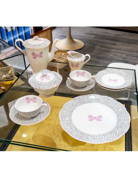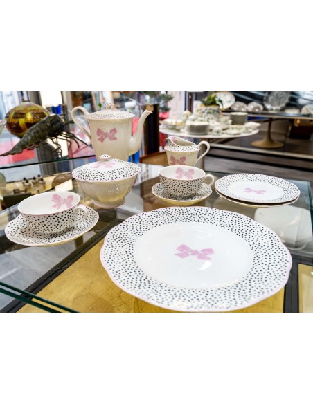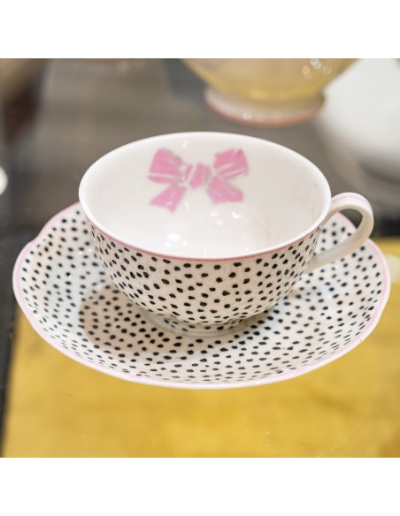 Décor de points mouchetés noirs et noeud rose, bord chantourné