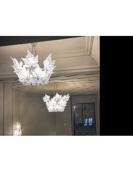 La suspension sur deux rangs est composée de feuilles de platane en cristal moulé, pressé, satiné, mat et brillant, monture en métal.