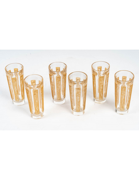 Ensemble de 6 gobelets aux motifs titre dans des réserves verticales. Épreuves en verre moulé-pressé (réf. Marcilhac 3400). Rehaussées avec une patine sienne d’origine.