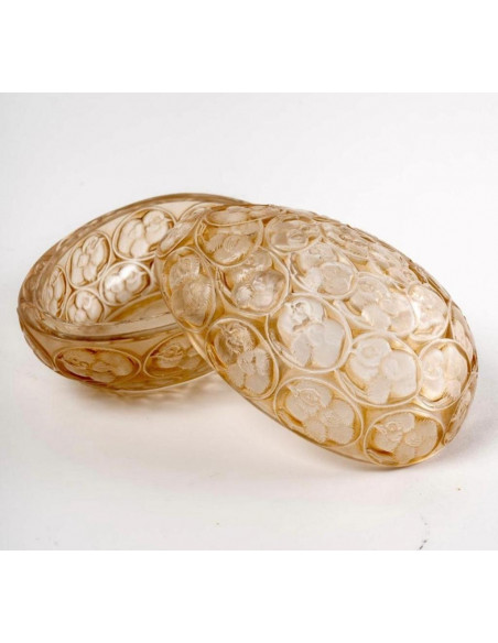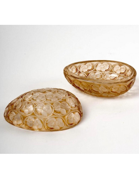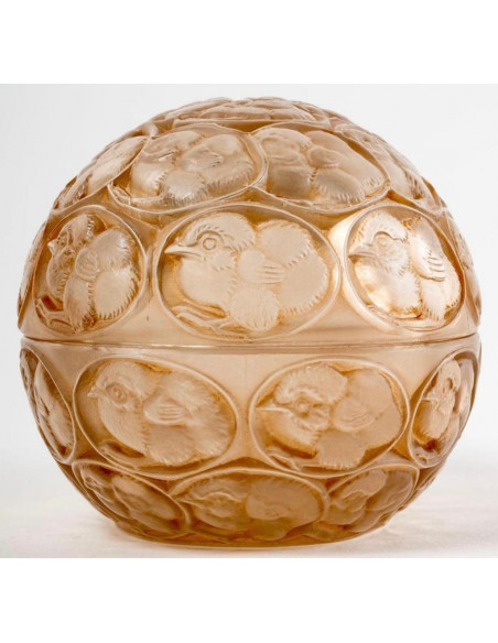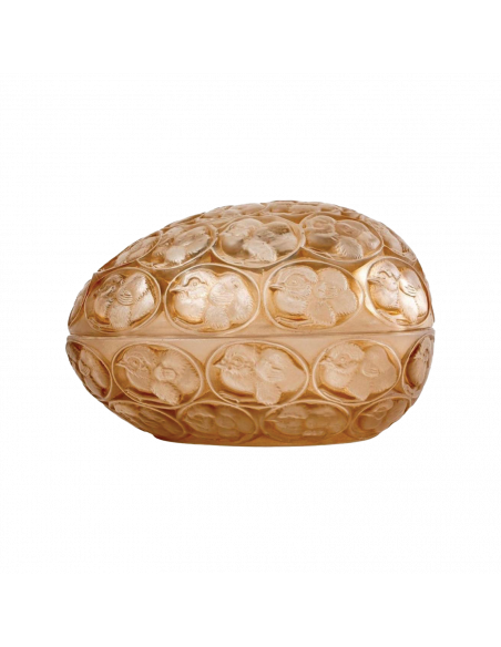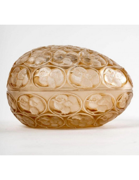 Boîte "Poussins" en verre blanc pressé moulé et rehaussé avec une patine sienne .