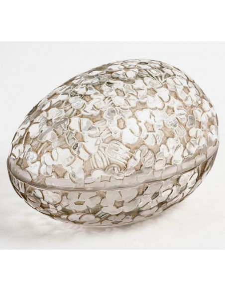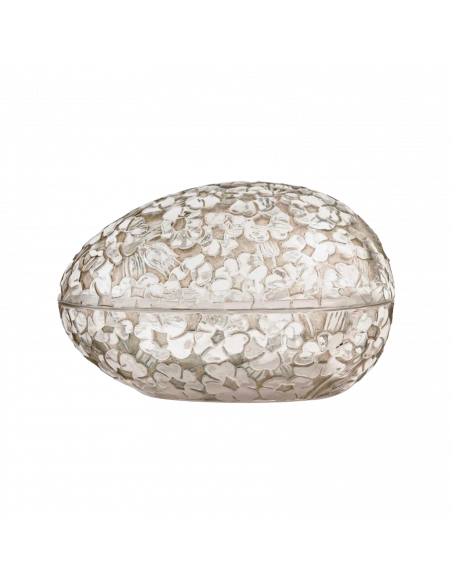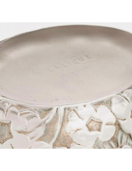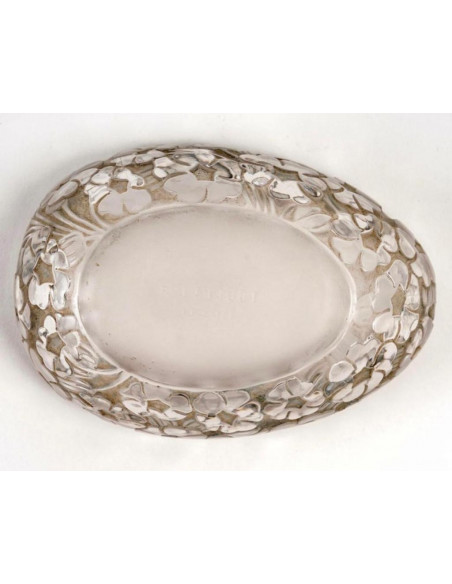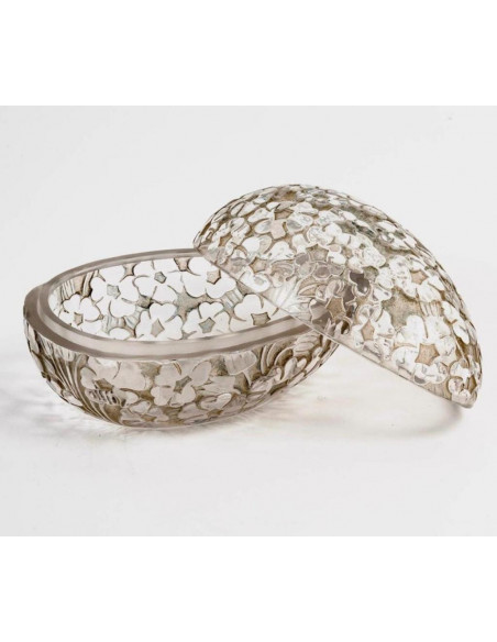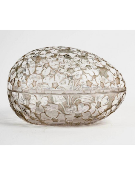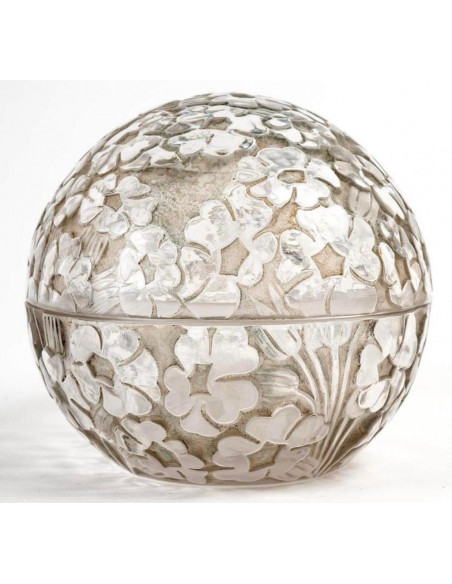 René LALIQUE Boîte "Pervenches" en verre blanc pressé moulé et patiné gris créée en 1929.
