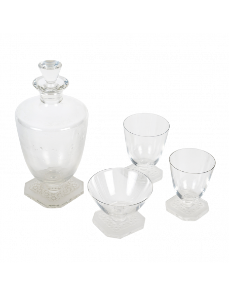 Bibliographie: Félix Marcilhac "René Lalique 1860-1945, maître verrier: analys e de l'oeuvre et catalogue raisonné". Reproduit p.852 sous les références 5329 (pichet) et 5330 (carafe). Figurent sur le tarif de 1937. Non continué après 1947.