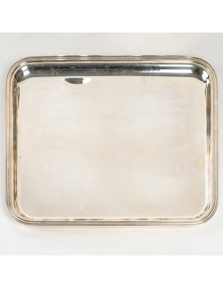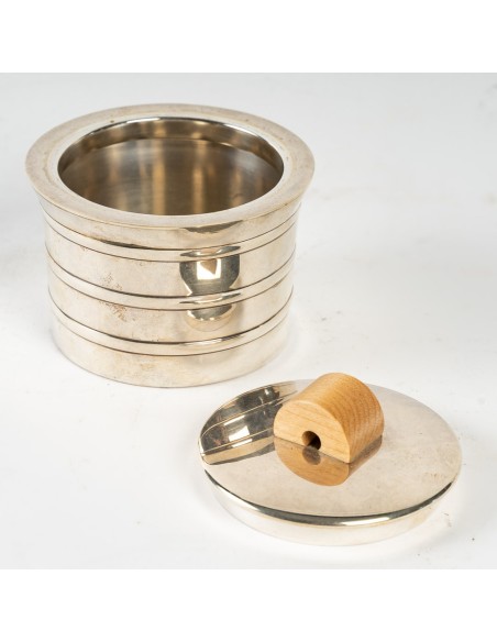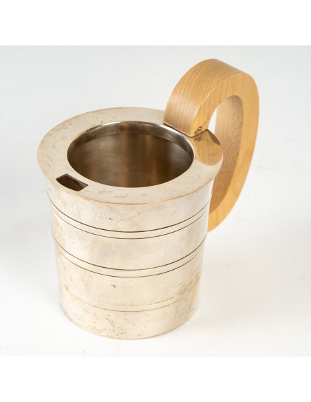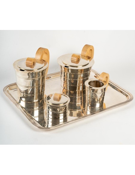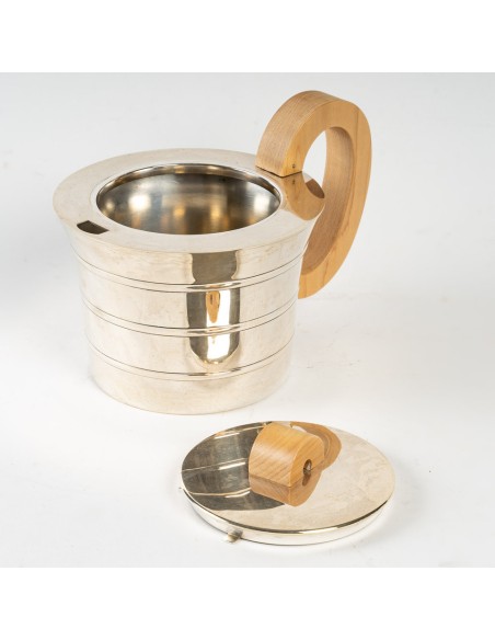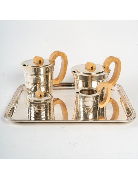 Comprenant une théière, un pot à eau chaude, un pot à lait et un sucrier couvert. Chaque pièce est de forme cylindrique effilée avec des nervures incisées. Les couvercles en forme de dôme sont surmontés de fleurons en noyer. Les poignées en noyer sont fixées aux corps. Chacun d'entre eux porte la marque et le cachet de Puiforcat, Paris. (4)